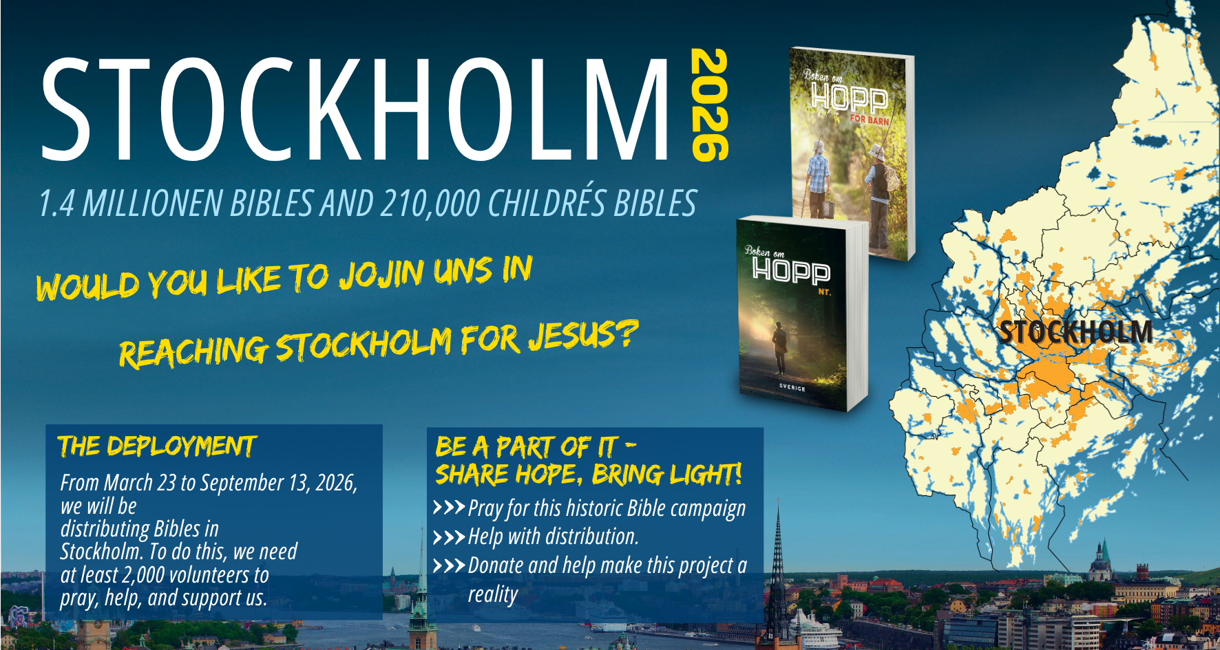 For Gothenburg alone, 500,000 NT Bibles and 75,000 children's Bibles are needed. It is a mighty commission from God to bring the Gospel to an entire country. But we have experienced the hand of God so powerfully that we dare to go further to reach new areas in Sweden with the Gospel for young and old.