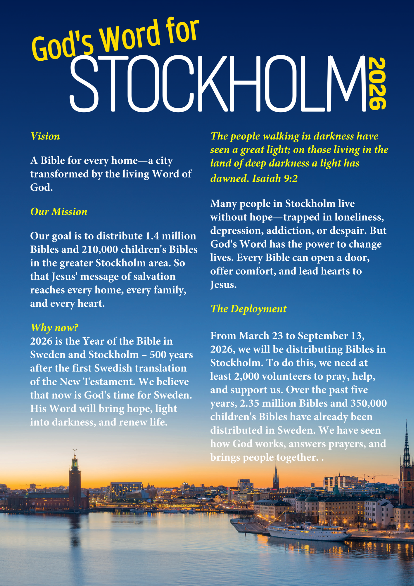 2026 is the Year of the Bible in Sweden and Stockholm – 500 years after the first Swedish translation of the New Testament. We believe that now is God's time for Sweden. His Word will bring hope, light into darkness, and renew life.