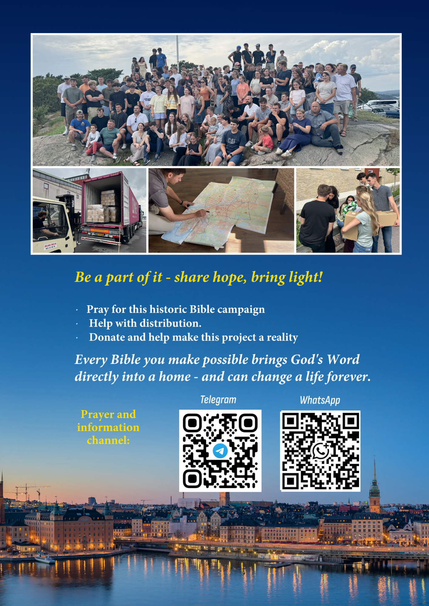 Many people in Stockholm live without hope—trapped in loneliness, depression, addiction, or despair. But God's Word has the power to change lives. Every Bible can open a door, offer comfort, and lead hearts to Jesus.