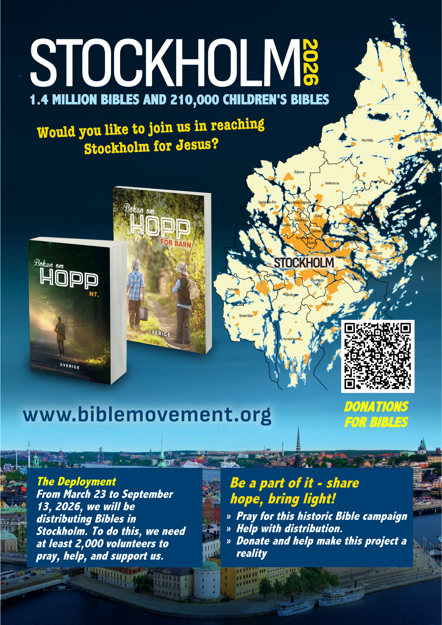 From March 23 to September 13, 2026, we will be distributing Bibles in Stockholm. To do this, we need at least 2,000 volunteers to pray, help, and support us. Over the past five years, 2.35 million Bibles and 350,000 children's Bibles have already been distributed in Sweden. We have seen how God works, answers prayers, and brings people together. .